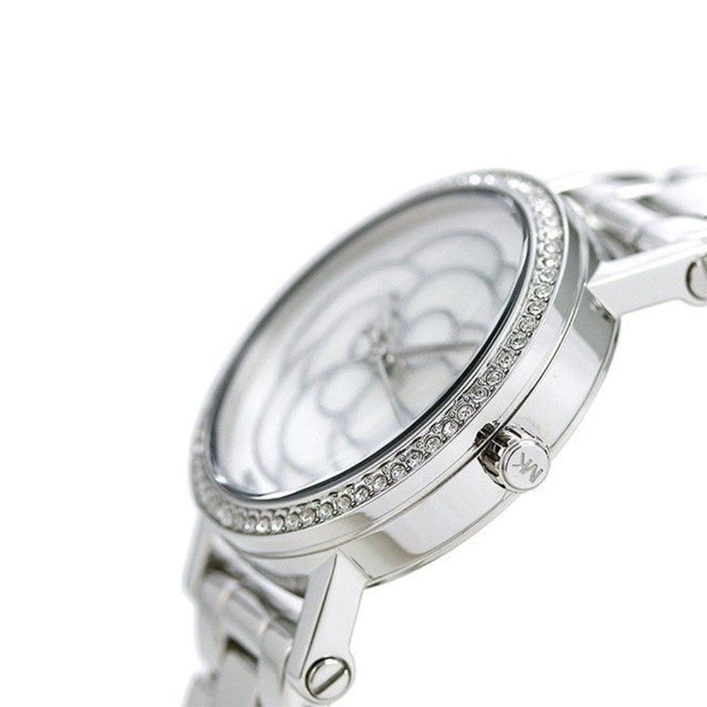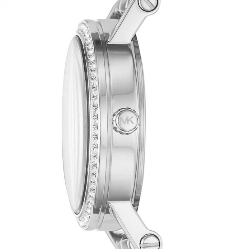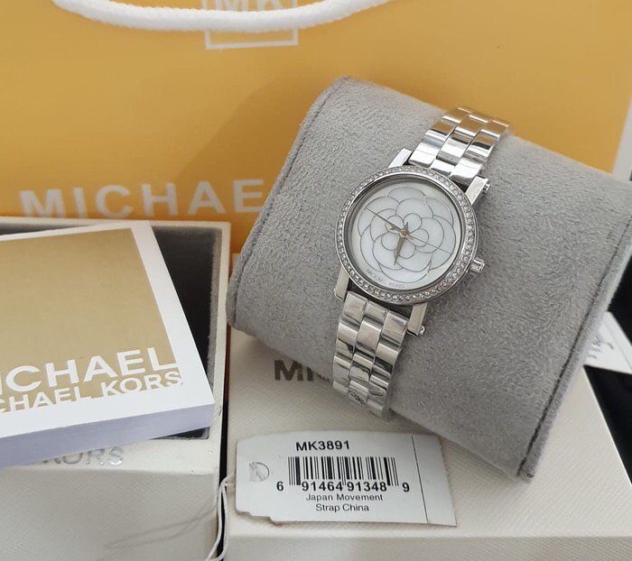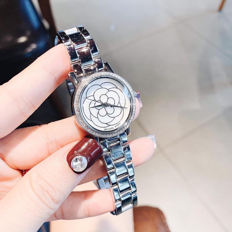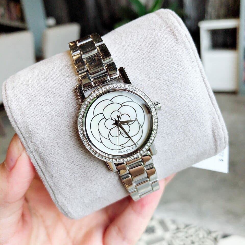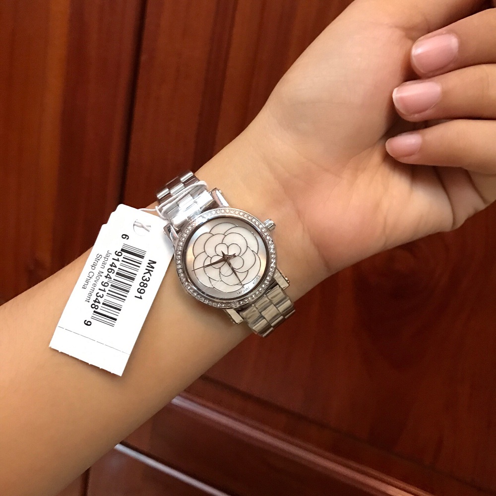 Đồng hồ Michael Kors MK3891 với case 28mm nhỏ nhắn xinh xắn cộng với mặt ánh sà cừ óng ánh bông họa tuyệt đẹp, vỏ màu silver sáng bóng với chất liệu thép không gỉ, dây thanh mảnh ôm tay tạo cảm giác dễ chịu.