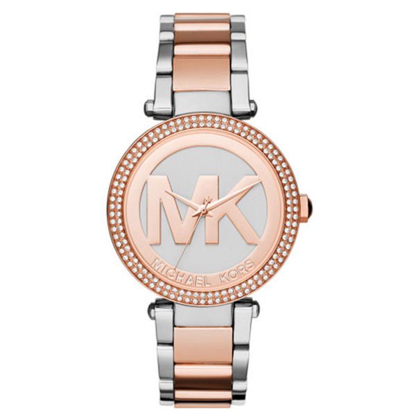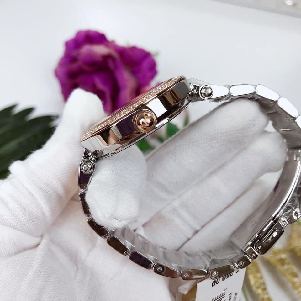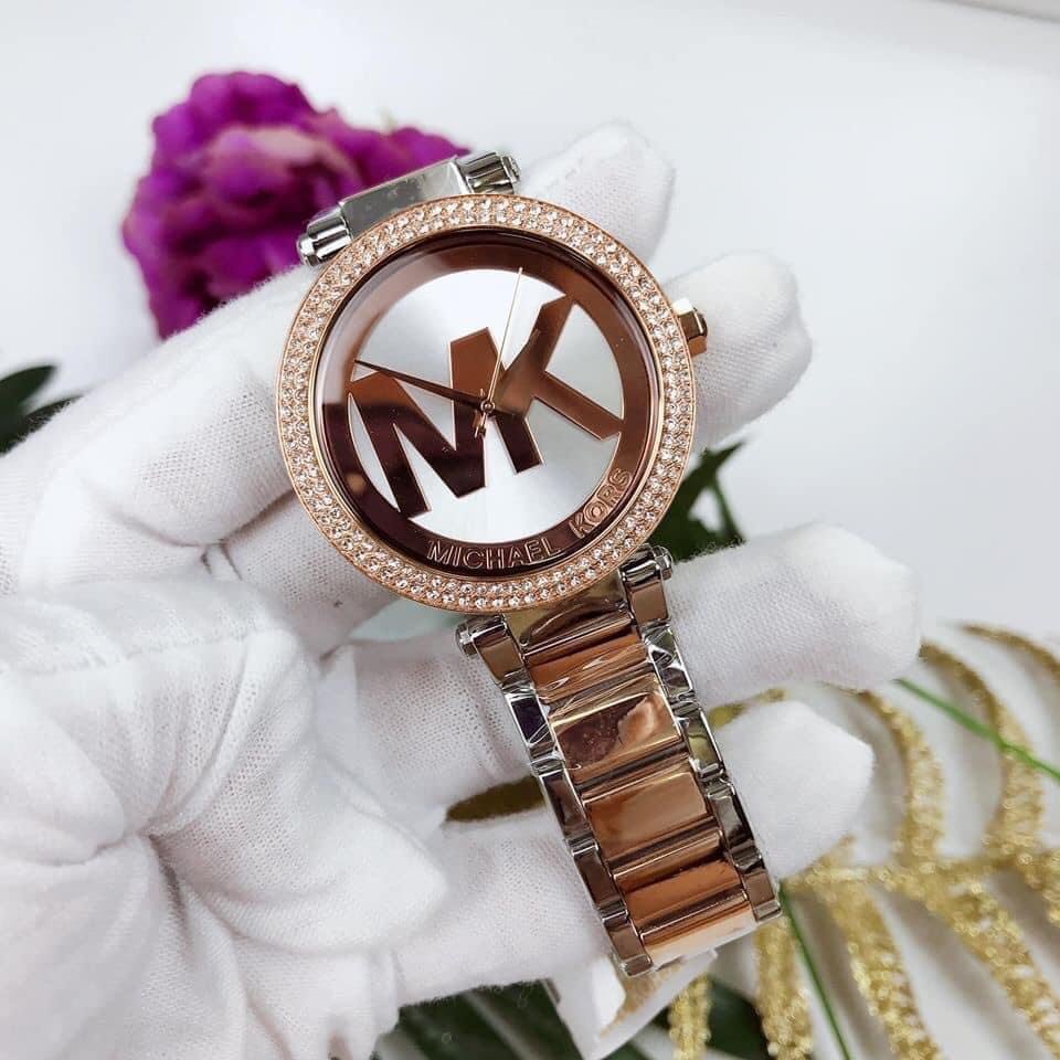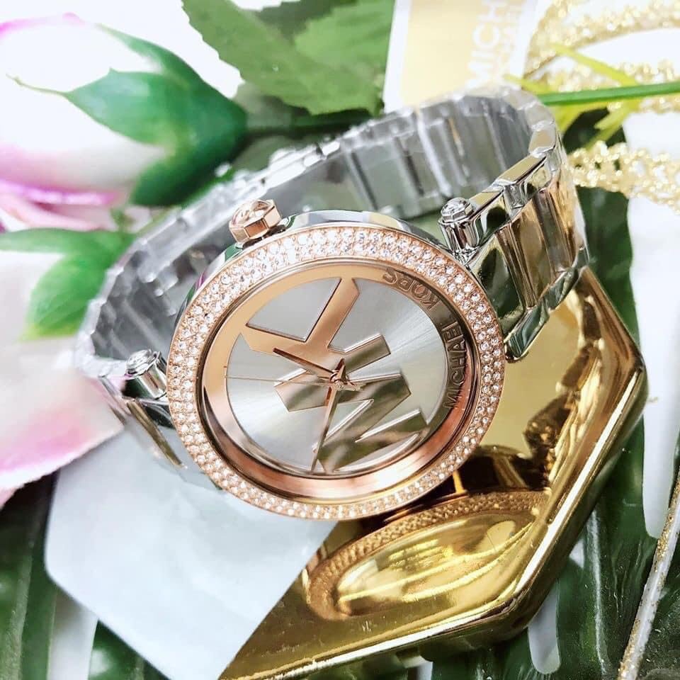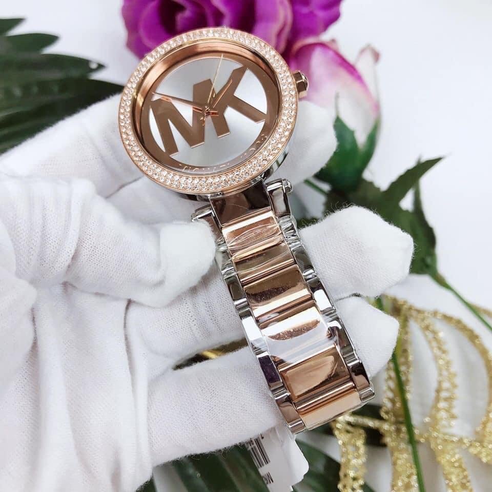 Đồng hồ Michael Kors MK6314 Case 38mm viền 2 vòng đá sáng long lanh, logo MK ấn tượng. Dây mang kết hợp 2 tone màu tạo nên tổng thể sang trọng