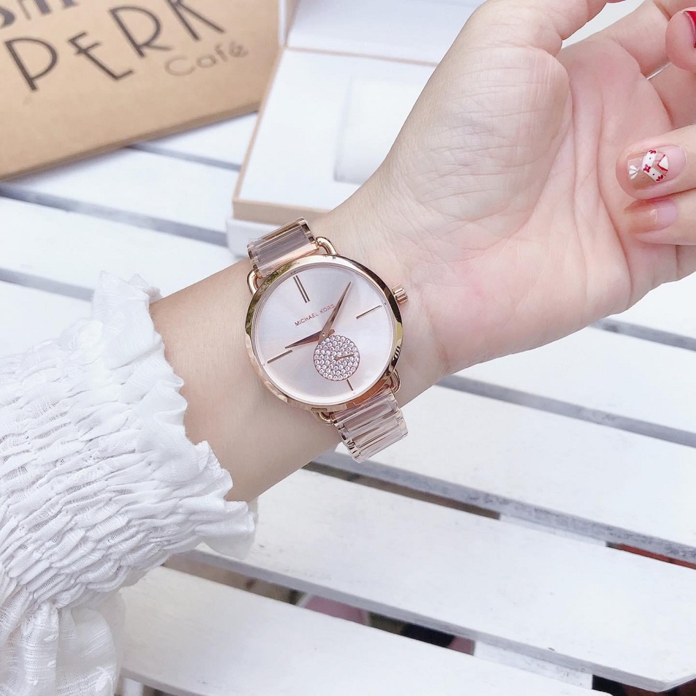 Đồng hồ Nữ Michael Kors Portia MK3640 tông vàng hồng thiết kế mặt tối giản với điểm nhấn là mặt kim giây nhỏ đính full pha lê rất iu và sang