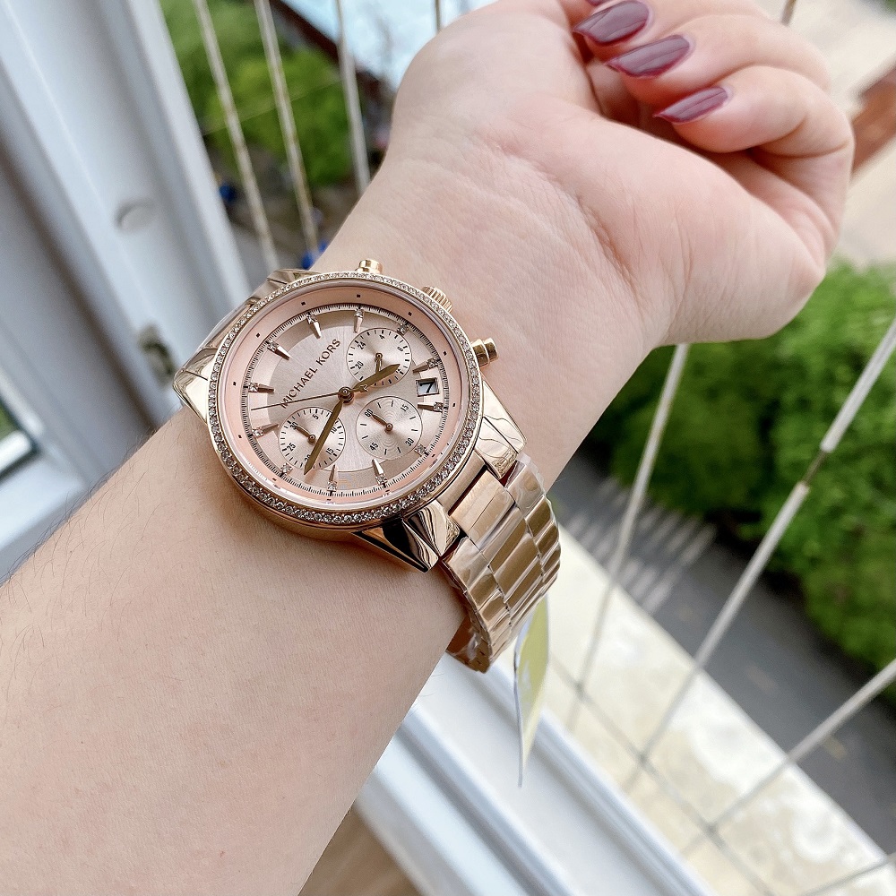 Đồng hồ Michael Kors MK6357 với thiết kế vỏ và dây màu vàng hồng mạ PVD. Mặt đồng hồ 6 kim độc đáo. Viền xung quanh là những viên pha lê cao cấp
