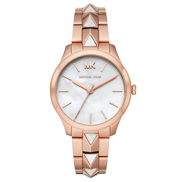 Đồng hồ Michael Kors MK6671 Thanh lịch và hiện đại, đồng hồ Runway Mercer được đúc bằng thép không gỉ màu vàng hồng với thiết kế liên kết trung tâm lấy cảm hứng từ khóa Mercer. Mặt số xà cừ và các điểm nhấn hoàn thành giao diện. Khoá cài gập an toàn