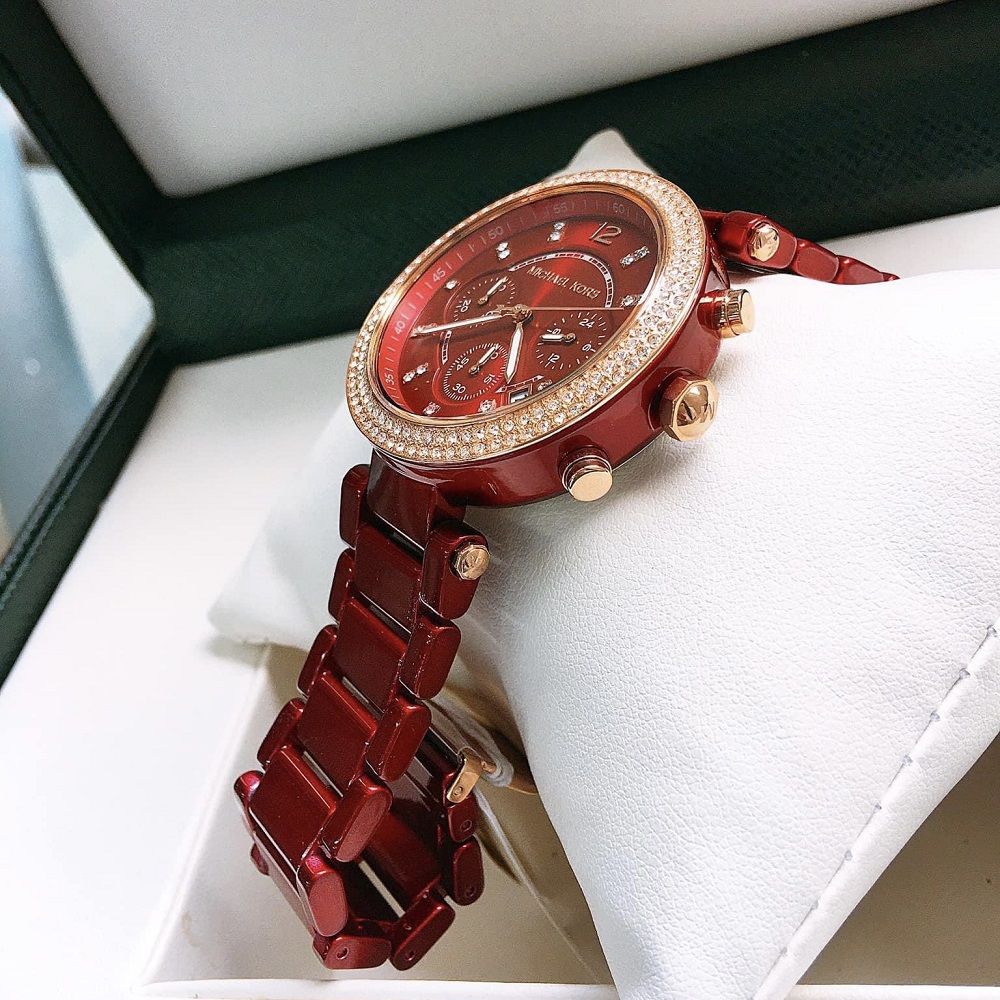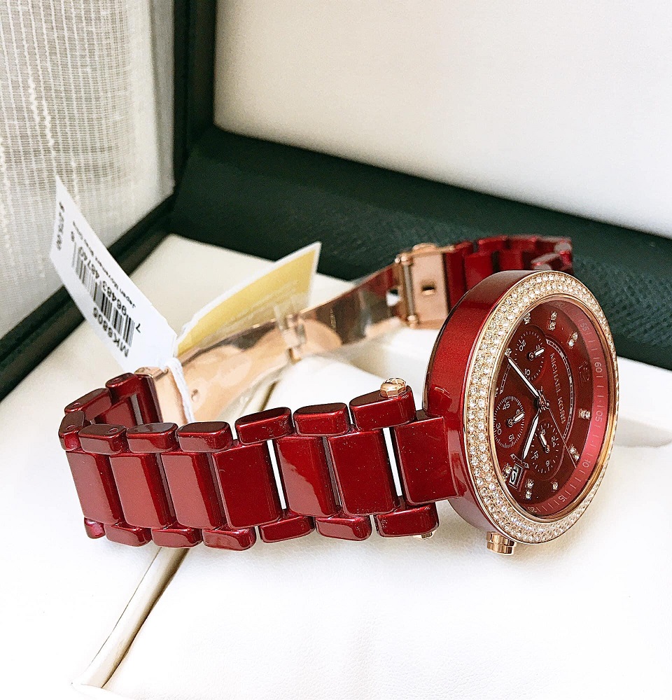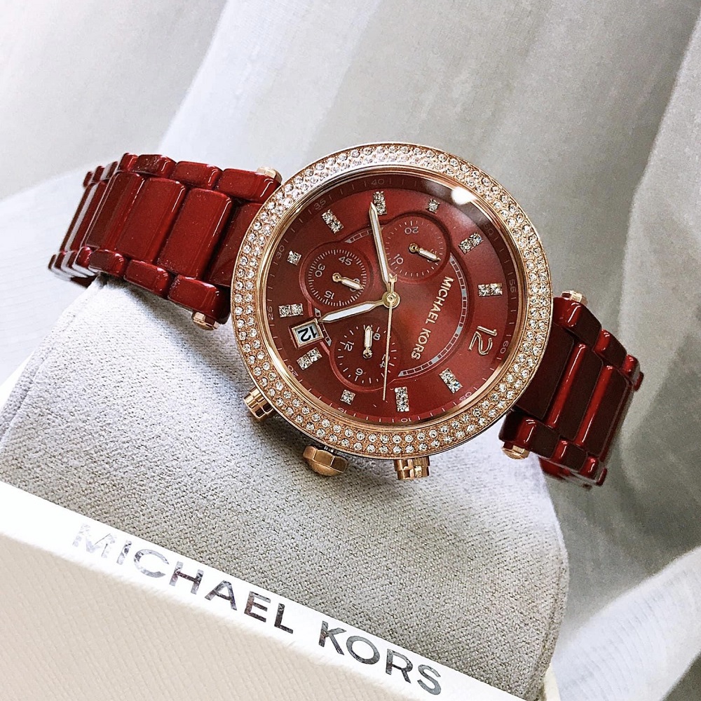 Đồng hồ Nữ Michael Kors MK6805 Parker với tone màu đỏ sang trọng kèm thiết kế 6 Kim giờ, phút, giây . Máy Chronograph, bằng kính Khoáng, phối số chỉ giờ