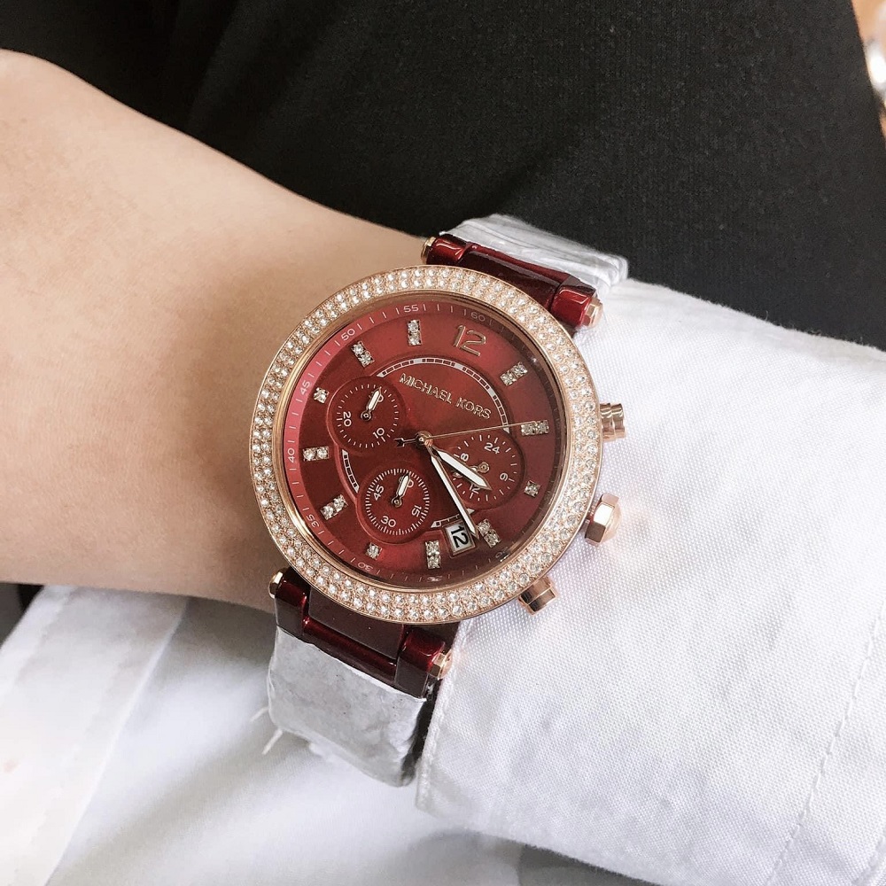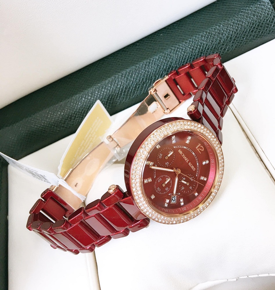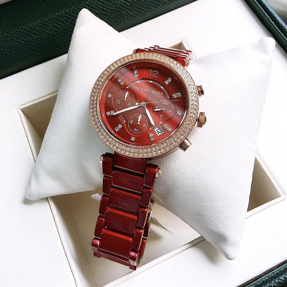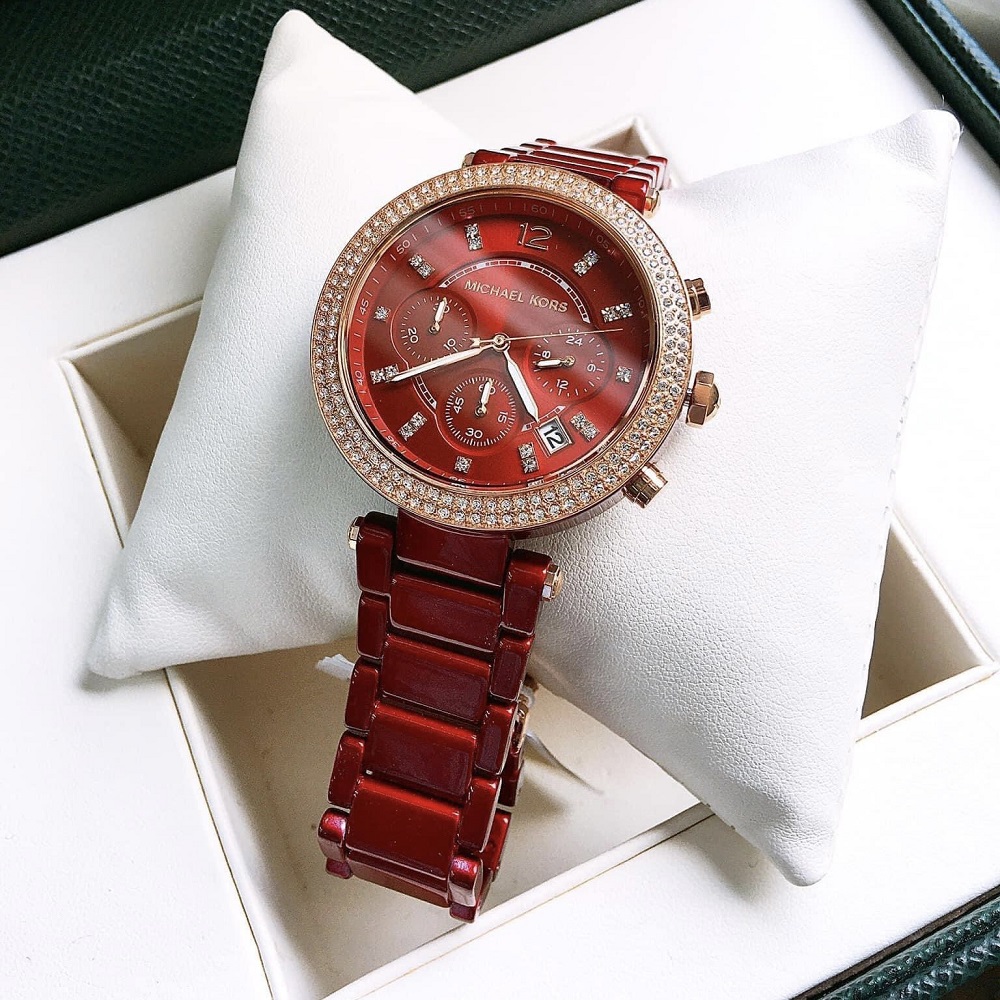 Đồng hồ Nữ Michael Kors MK6805 Parker với tone màu đỏ sang trọng kèm thiết kế 6 Kim giờ, phút, giây . Máy Chronograph, bằng kính Khoáng, phối số chỉ giờ